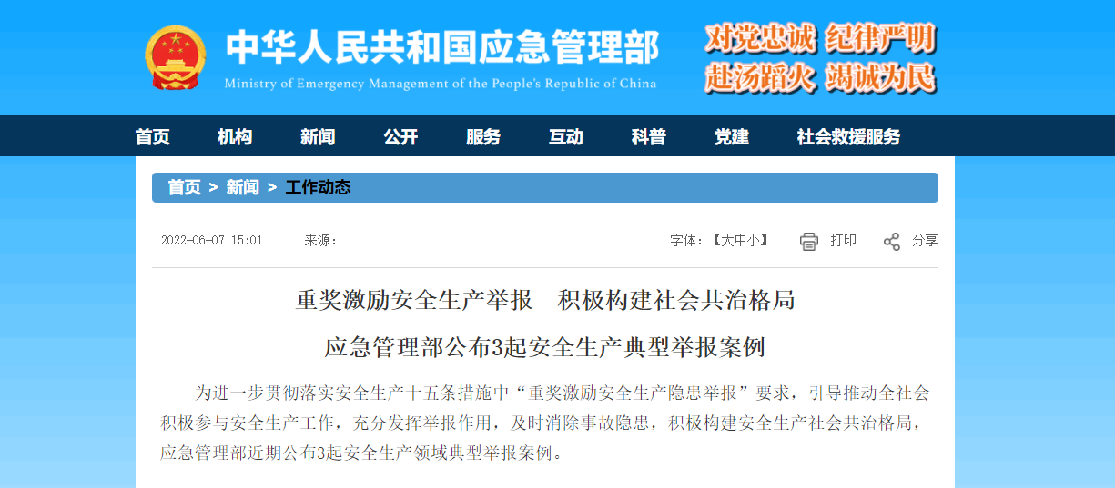 重獎激勵安全生產(chǎn)舉報,積極構(gòu)建社會共治格局,應急管理部公布3起安全生產(chǎn)典型舉報案例